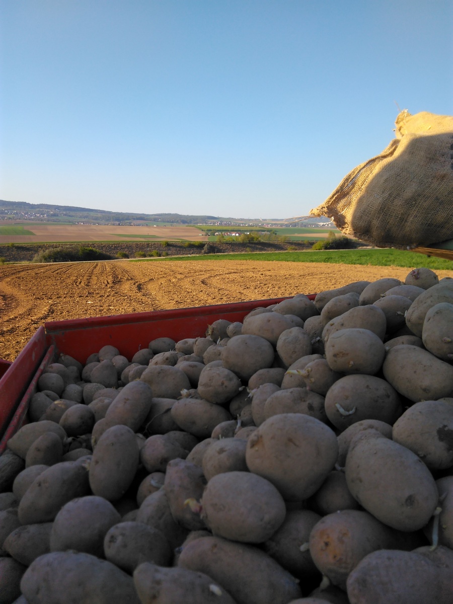 Speisekartoffel: Zum üblichen Anbautermin im Frühjahr pflanzen wir mehrere Sorten Kartoffeln an. Nach der Ernte werden die Kartoffeln in unserem 150 Jahre altem Erdkeller, unter optimalen Bedingungen, gelagert. Nach alt-herkömmlicher Art sortieren und verpacken wir die Kartoffeln kurz vor dem Verkauf in Gebinde von 2 kg, 5 kg und 10 kg. Perfekt geeignet für die Zubereitung von Salaten, Knödel und Beilagen.